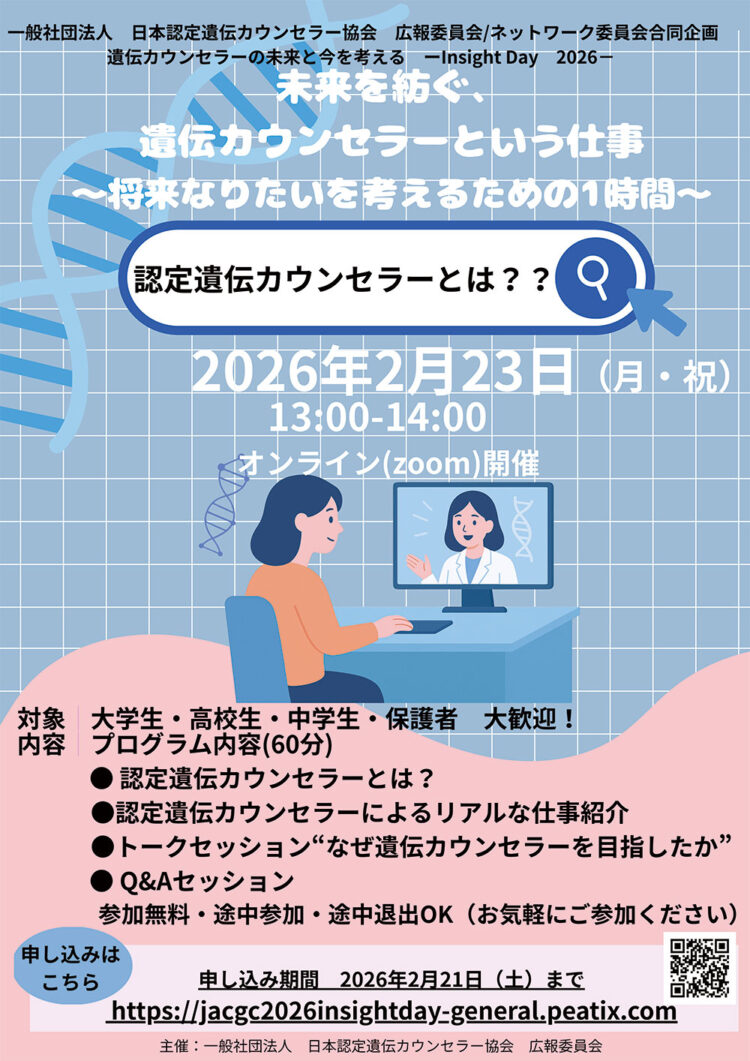 学会などの活動報告や認定遺伝カウンセラーへのインタビュー、ゲノム医療や遺伝教育などに関して、専門家の立場から、よりわかりやすい内容で発信しています。